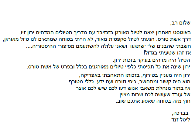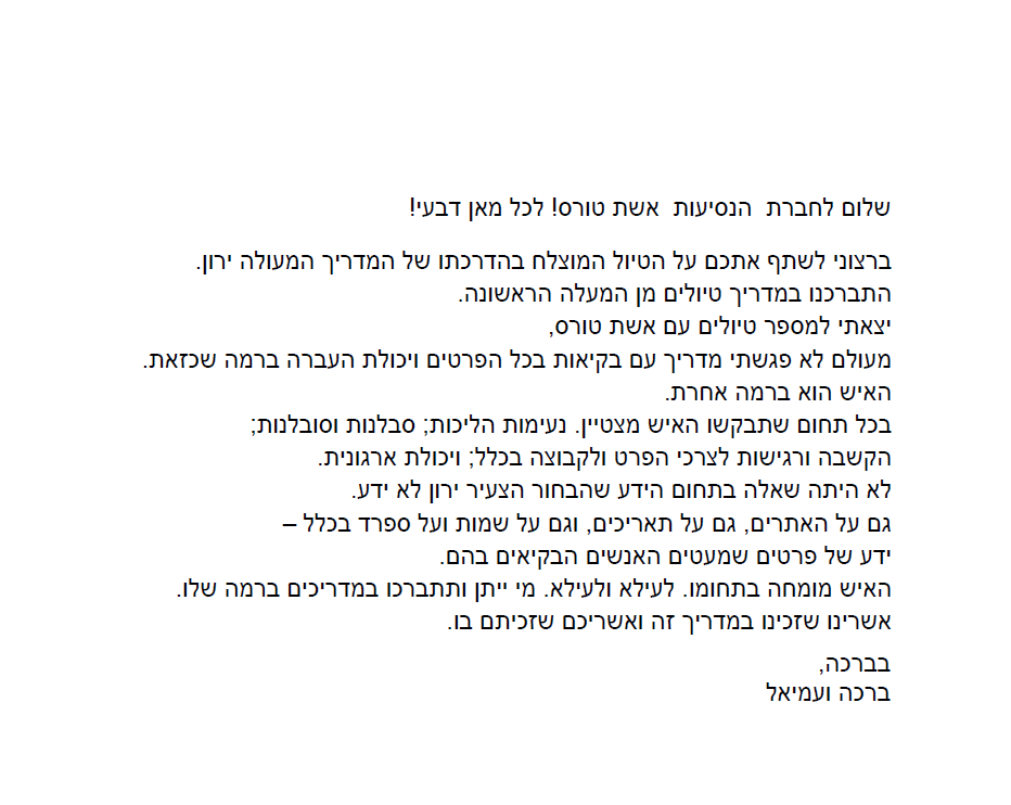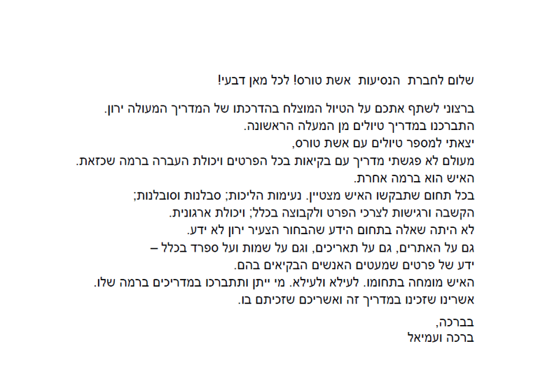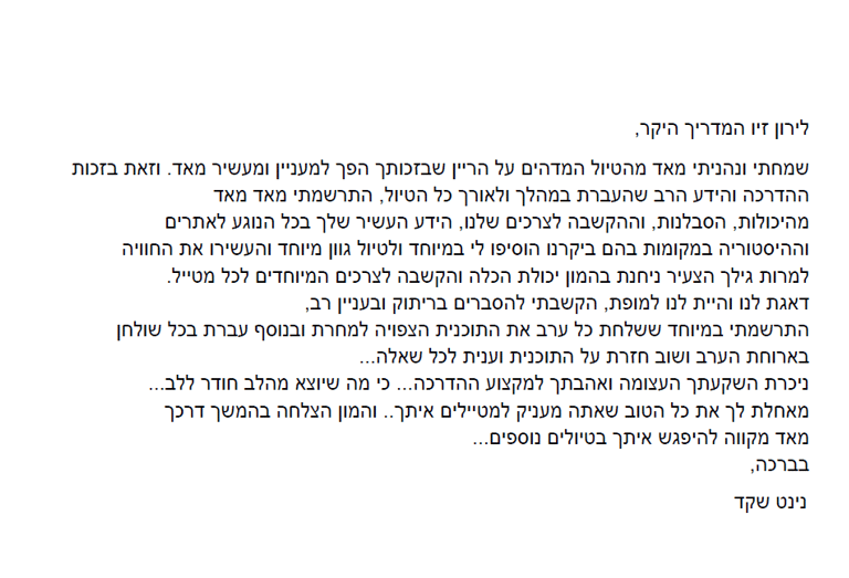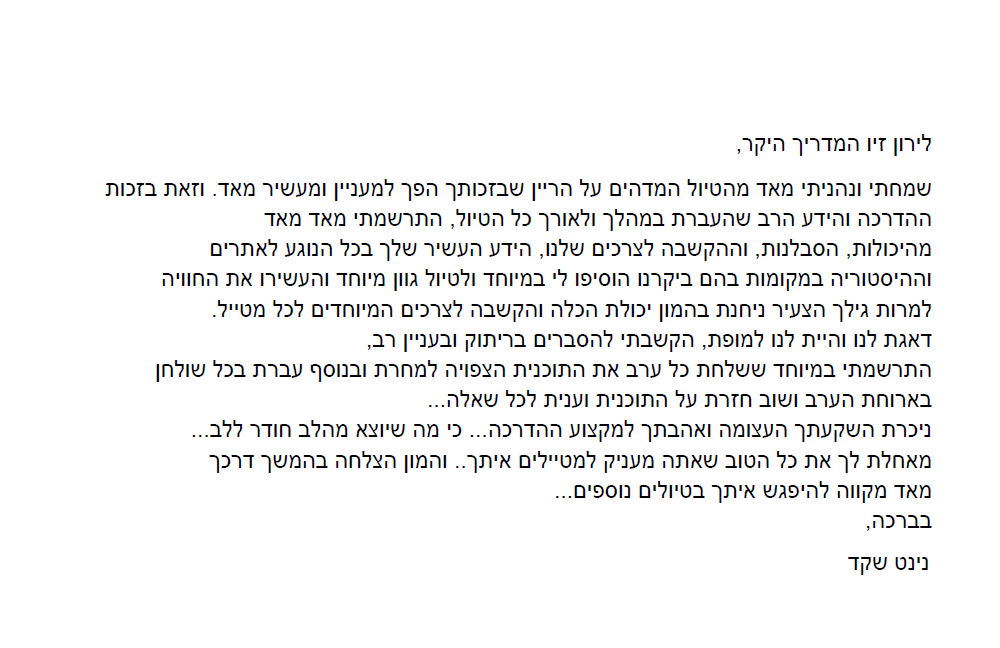 - שילוב של ידע היסטורי ותרבותי מעמיק, שמועבר באמצעות סיפורים מרתקים שמביאים את היעד לחיים.